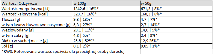 Wartość kaloryczna [kcal] | 320,7 | 16%* | 160,3 | 8%* |