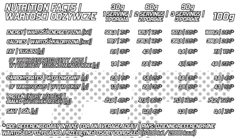Zalecana porcja do spożycia w ciągu dnia: 1 porcję – 30g (ok 1,5 miarki) rozpuścić w 200 ml mleka lub wody.