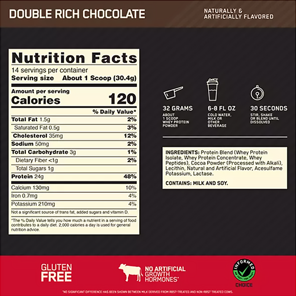 Każda porcja dostarcza aż 24 g biologicznie najwyższej wartości białka serwatkowego będącego specjalistyczną mieszaniną frakcji protein produkcji OPTIMUM NUTRITION. Ta jedyna w swoim rodzaju formuła wytworzona w odpowiednim zakresie niskich temperatur zawiera koncentrat białka serwatki (WPC), mikrofiltrowany krzyżowo izolat białka serwatkowego (WPI) oraz w pełni zhydrolizowany izolat, co czyni ten produkt najbardziej wartościowym z dostępnych na rynku.